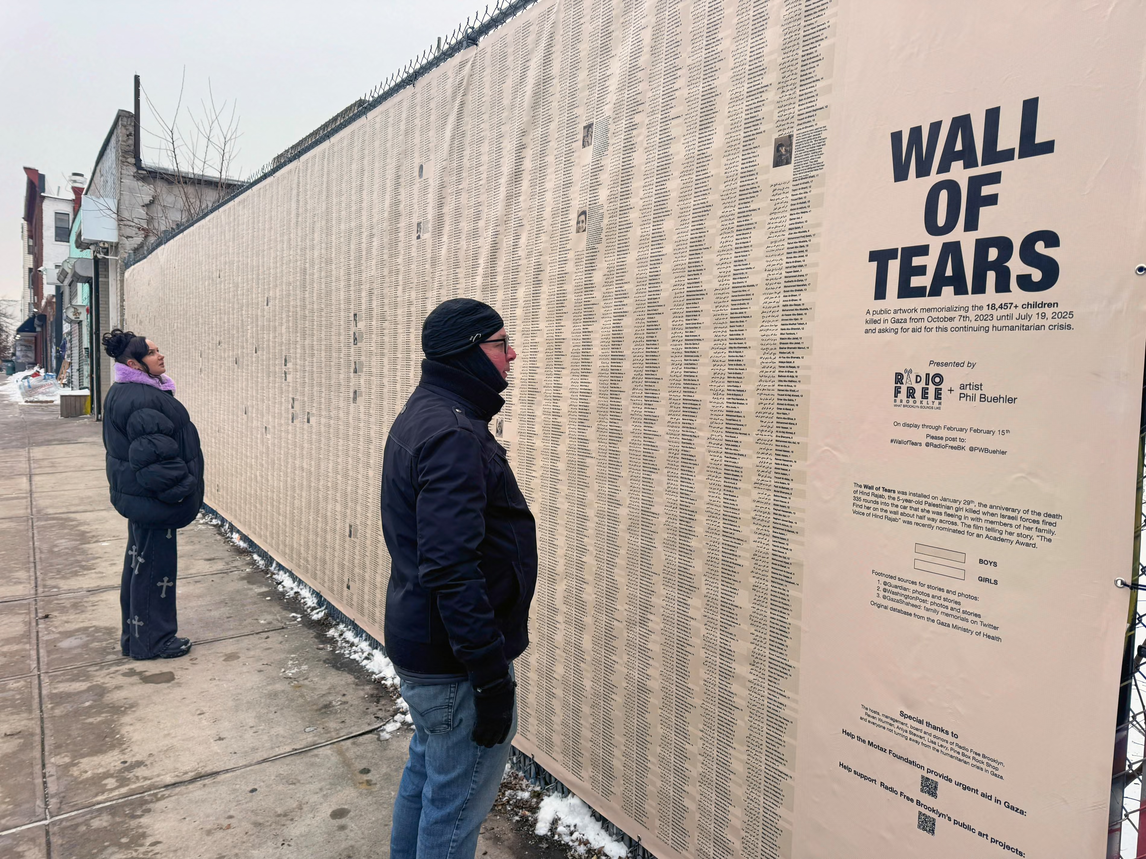 These names of two children mark the beginning and end of the Wall of Tears, a massive art installation paying homage to the 18,457 children killed in Gaza between 7 October 2023 and 19 July 2025. Created by artist Phil Buehler, it opened next to Pine Box Rock Shop bar at 12 Grattan Street in Brooklyn, New York, on Thursday.